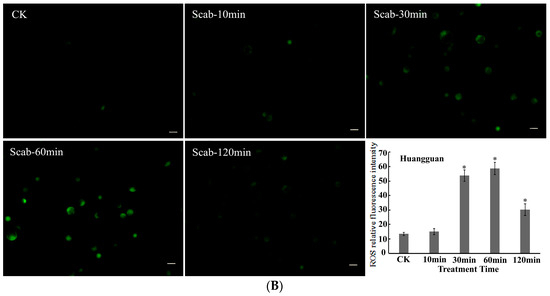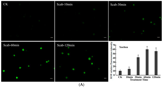 V. nashicola-induced changes in the fluorescence intensity of reactive oxygen species (ROS) in (A) Xuehua and (B) Huangguan pear protoplasts. Fluorescence microphotographs were taken at 20× magnification and show dynamic changes in the fluorescence intensity of ROS at 0 min (Ctrl), 10 min (Scab-10 min), 30 min (Scab-30 min), 60 min (Scab-60 min), and 120 min (Scab-120 min) following V. nashicola infection (bars = 20 μm). Histograms show the relative fluorescence intensity of intracellular ROS at different timepoints analyzed using Image-Pro Plus v6.0 software.Asterisks denote significant differences from control (* p < 0.05).