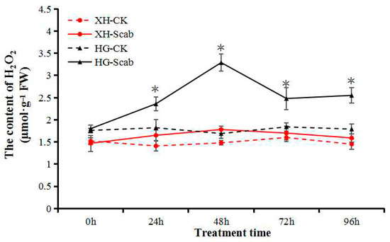 V. nashicola-induced changes in H2O2 content in Xuehua and Huangguan fruit calluses. XH, Xuehua; HG, Huangguan; CK, uninfected control; Scab, infected by V. nashicola. * p < 0.05.