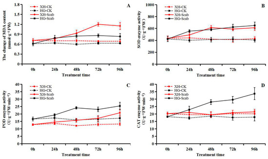 Dynamic changes of malondialdehyde (MDA) content and antioxidant enzyme activity (superoxide dismutase, SOD; peroxidase, POD; catalase, CAT) in pear infected by V. nashicola (within 96 h). (A) MDA content; (B) SOD enzyme activity; (C) POD enzyme activity; (D) CAT enzyme activity.