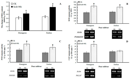 Effects of V. nashicola infection on MDA content and antioxidant enzyme activity in two different pear cultivars. CK, uninfected control; Scab-96 h, fruit-derived calluses at 96 h post-infection with V. nashicola. (A) MDA content; (B) SOD enzyme activity and PbMnSOD gene expression; (C) POD enzyme activity and PbPOD gene expression; (D) CAT enzyme activity and PbCAT gene expression. * p < 0.05.