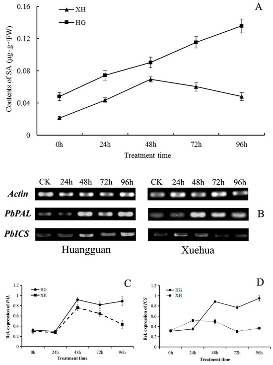 Effects of V. nashicola infection on salicylic acid (SA) biosynthesis in pear leaves. (A) Free SA content in Huangguan (HG) and Xuehua (XH); (B) expression of SA biosynthesis genes PbPAL and PbICS detected by semi-quantitative PCR; (C,D) relative expression changes of PbPAL and PbICS genes analyzed using Quantity One software; 0 h and CK, uninfected controls; 24 h–96 h, timepoints post-infection by V. nashicola.