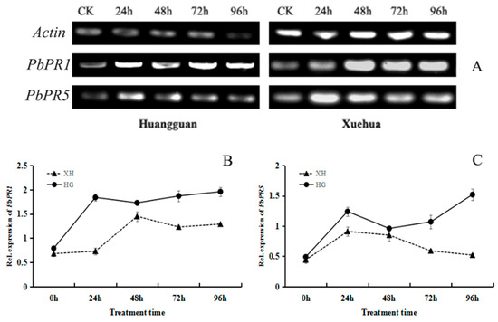 Effects of V. nashicola infection on expression of pathogenicity-related genes in pear leaves. (A) Expression of PbPR1 and PbPR5 detected by semi-quantitative PCR; (B,C) relative expression changes of PbPR1 and PbPR5 genes analyzed using Quantity One software. CK, uninfected control; 24 h–96 h, timepoints post-infection by V. nashicola. HG, Huangguan’; XH, Xuehua.