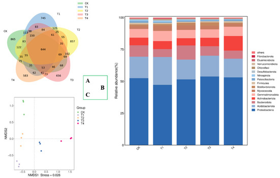 Effect of biochar composting products on the bacterial community profiles of the soil. (A) Specific and shared OTUs in different treatments; (B) relative abundance of bacteria at phylum level; (C) nonmetric multidimensional scaling (NMDS) ordination plots of bacterial community composition in different treatments based on the Bray–Curtis distance similarity. The bacterial phyla representing < 0.5% of the total bacterial sequences and not identified at the phylum level were all assigned to “Others”. Ellipses in the plots denote 95% confidence intervals for the centroids of different treatments. Bray–Curtis distance similarity considers the measurement method of sample abundance. CK, control, compost without biochar; T1, 1% biochar composting product (BCP) treatment; T2, 3% BCP treatment; T3, 5% BCP treatment; T4, 7% BCP treatment.