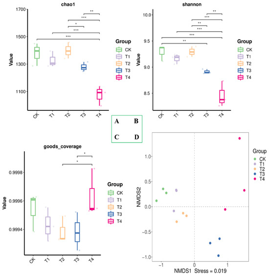 The BCP treatments were found to enhance the bacterial community’s diversity within the soil (Figure 1). There were 865, 745, 857, 656 and 583 unique operational taxonomic units (OTUs) observed in the groups of CK, T1, T2, T3 and T4, respectively. The bacterial community compositions of rhizosphere soils were changed within different BCP treatments. These results were also consistent with the NMDS ordination (Figure 1B). The different bacterial community compositions were also shown by the relative abundances of bacterial taxa at the phylum level (Figure 1C). The dominant taxa were Proteobacteria and Actinobacteria, followed by Bacteroidetes, Actinobacteriota, Gemmatimonadota, Myxococcota, Bdellovibrionota and Firmicutes, which accounted for more than 90% of the total bacterial sequences (Figure 1C). Furthermore, the bacterial community diversity difference was proved according to alpha and beta diversity analyses (Figure 2). The T4 treatment exhibited the lowest Chao1 (Figure 2A) and Shannon indices (Figure 2B) compared to all other treatments and exhibited the highest goods-average index of bacteria in the rhizosphere soils (Figure 2C). The nonmetric multidimensional scaling (NMDS) analysis revealed that different BCP treatments affect the distribution of the rhizosphere soil samples (Figure 2C). For samples located in different quadrants, the same color points represent the same group sample and indicate significant differences in bacterial communities after the BCP treatments.