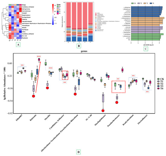Effect of biochar composting products on bacterial relative abundance at genus level of soil microbiota. (A) Heatmap at the genus level; (B) relative abundance of top 15 dominant bacterial genera in different treatments; (C) LDA scores of rhizosphere soils in different treatments; (D) ANOVA analysis based on genus level in different treatments. Heatmap results are indicated by different colors. Red indicates a high relative abundance of species, while blue indicates a low relative abundance of species. CK, control, compost without biochar; T1, 1% biochar composting product (BCP) treatment; T2, 3% BCP treatment; T3, 5% BCP treatment; T4, 7% BCP treatment. Different letters indicate statistically significant differences (n = 5, p < 0.05). The “**” means p < 0.01, and the “***” means p < 0.001.