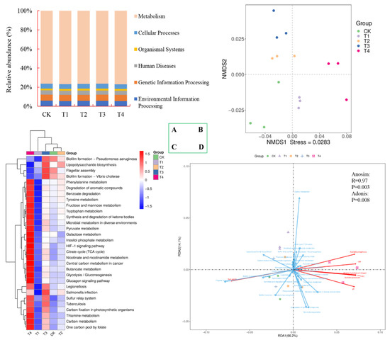 Effect of biochar composting products on soil bacterial metabolic function. (A) Relative abundance of six function categories; (B) NMDS ordination plots of soil bacterial function composition in BCP treatments based on the Bray–Curtis distance similarity; (C) relative abundance of the top 30 functional gene families; (D) redundancy analysis (RDA) revealing relationship of selected physicochemical properties and metabolic function of bacterial communities. KEGG results were predicted at level-1 according to Kruskal–Wallis algorithm. Gene families are colored by functional categories. CK, control, compost without biochar; T1, 1% biochar composting product (BCP) treatment; T2, 3% BCP treatment; T3, 5% BCP treatment; T4, 7% BCP treatment. Different letters indicate statistically significant differences (n = 5, p < 0.05).