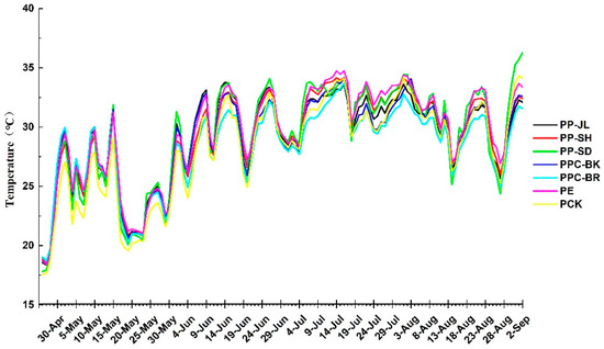 The soil daily average temperatures of each treatment were analyzed, and the results showed that the PE film-covered soil was the highest at PE (29.55 °C), followed by PP-SD (29.37 °C), PP-SH (29.17 °C), PP-JL (29.09 °C), PPC-BK (28.95 °C), PPC-BR (28.35 °C), and PCK (28.26 °C) (Figure 1).
