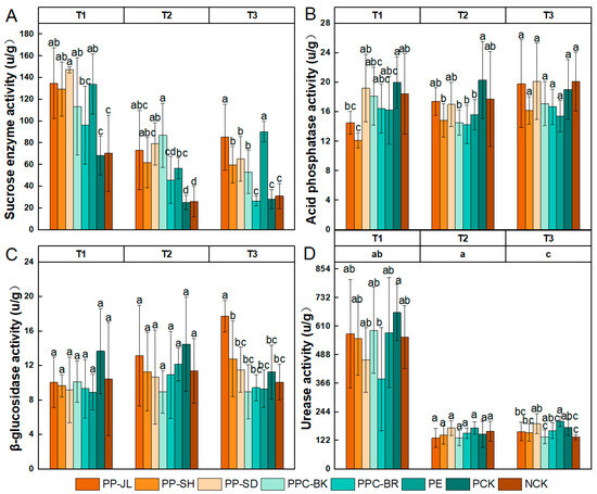 Dynamics of soil enzyme activity with different mulches. Bars represent the standard errors calculated from three replicates. Bars that do not share the same letter represent significant differences among treatments (p < 0.05) according to one-way ANOVA. (A) Soil sucrose enzyme activity; (B) Soil acid phosphatase activity; (C) Soil β-glucosidase activity; (D) Soil urease activity. T1: 10 May. T2: 10 June. T3: 10 July. Biodegradable mulch films: PP-JL, PP-SD, PP-SH, PPC-BK, and PPC-BR. Polyethylene mulch: PE. Straw mulching: NCK. Uncovered control: PCK.
