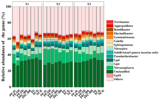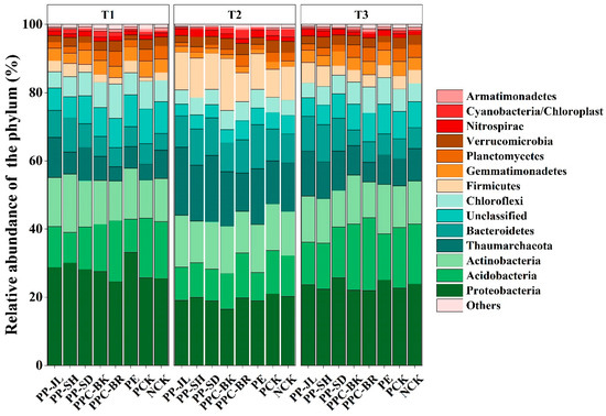The biological classification of soil bacteria from the eight treatments was analyzed. At the phylum level, the soil bacteria in each treatment included 43 phyla, but only 11 of them were dominant phyla with a relative abundance > 1% in three periods (Figure 3). The bacteria composition of the eight treatments was similar, including Proteobacteria, Acidobacteria, Actinobacteria, Thaumarchaeota, Bacteroidetes, Chloroflexi, Firmicutes, Gemmatimonadetes, Planctomycetes, Verrucomicrobia, and Nitrospirae, which accounted for 86.7–95.2% of the total bacterial community. From the T1 to T3 period, the population abundance of Thaumarchaeota and Firmicutes showed an increasing trend followed by a decreasing trend with the extension of mulching time, while the population abundance of Actinobacteria showed no significant change. Comparing the abundance of microbial populations at the phylum level among the treatments, the abundance of Proteobacteria in the PE treatment was significantly higher than in the other treatments. Compared with T1, the abundance of Thaumarchaeota was increased significantly in T2, with an increase of 10.0% in the PE treatment and an increase ranging from 5.9% to 10.0% in the other treatments. In addition, the abundance of Firmicutes increased by 6.6–12.9% in T2, with the highest increase in the PPC-BK treatment (12.9%).