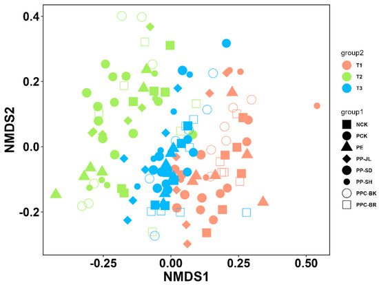 Non-metric multidimensional scaling (NMDS) was used to analyze the β-diversity of soil bacterial communities in each treatment. In NMDS analysis, the closer the distance between samples, the more similar their species composition structure is. In the T1 period, PE treatment was distributed widely and could not be well separated from other treatments, indicating that the structural difference in species composition was small between PE and other treatments (Figure 5). However, in the T2 period, the PE was distributed compactly, so the overlap between PE and other treatments was decreased, indicating an increasing differentiation in structural composition. Furthermore, the PE distribution was significantly clustered in the T3 period, and it did not overlap with PP-JL and PP-SH, indicating their significant difference in species composition. Overall, the difference between the BMF treatments and the PE treatment became more pronounced from the T1 to T3 period. In each treatment, the distance between samples had a tendency to cluster together, and the coverage type affected the composition of the bacterial community, but the clustering trend of T1, T2, and T3 was more prominent, indicating that the climatic conditions had a more significant impact on the bacterial community.