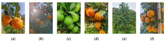 Some Gannan navel orange samples in different environments. (a) forward light; (b) backward light; (c) rainy; (d) overlap; (e) long-distance vision; (f) dense.