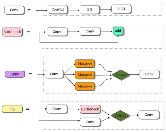 The component of the YOLOv5 model. Conv denotes the convolution operation, C3 denotes the feature extraction module, SPPF denotes the spatial pyramid pooling structure, upSample is the upsampling operation, and Concat is the feature fusion function.