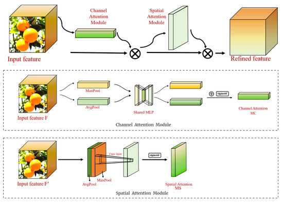 In order to better extract the ripeness characteristics of Gannan navel oranges under complex conditions and improve the model detection ability, the CBAM [30] attention mechanism is introduced, which consists of a channel attention module (CAM) and spatial attention module (SAM), and its structure is shown in Figure 4. In CAM, the input feature map F is subjected to the pooling operation, and then the number of channels is compressed through the fully connected layer. It is activated by the ReLU activation function and then expanded to the original number of channels through a fully connected layer to obtain two activated feature vectors for feature merging. Finally, the attention weight MC of the included channel is obtained using the softmax function. Finally, the feature vector is multiplied with the original feature map F to obtain the feature map F’, which is passed to SAM. In SAM, F’ undergoes a pooling operation to obtain 2 2D vectors, which are then subjected to a splicing and convolution operation and undergo a sigmoid function to obtain the spatial attention weights MS of the input features, and finally, the weights MS are multiplied with the corresponding elements of the input features to obtain the final feature map. The CBAM module can automatically obtain the importance of each feature space and feature. The CBAM module can automatically obtain the importance degree of each feature space and channel by learning and then assign different weights according to the importance degree to multiply the attention map with the input feature map for adaptive feature optimisation, which overcomes the limitations of traditional convolutional neural networks in dealing with information of different scales, shapes, and orientations and at the same time, suppresses noise and other irrelevant information. Since CBAM is a lightweight and general-purpose module, the overhead of the module can be ignored and seamlessly integrated into all C3 architectures in the backbone layer for end-to-end training together with the underlying convolutional module, which can effectively avoid the influence of light, environment, brightness, background, and other factors in the recognition process of Gannan navel oranges and improve the ability to perceive the features of Gannan navel orange fruits to achieve all-weather picking.