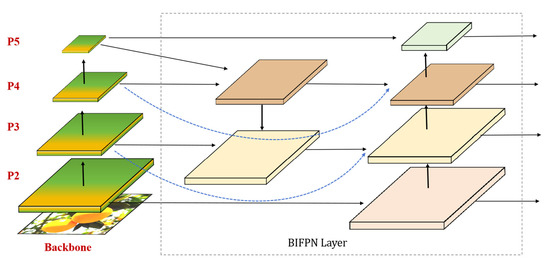 A bidirectional feature pyramid network structure (BiFPN) [31] is introduced in the neck layer to replace the path aggregation Network (PANet) [32] structure, which solves the problems of insufficient information transfer and inaccurate feature fusion in the traditional feature pyramid network. The network introduces an adaptive weight adjustment mechanism, which can automatically learn the importance of each feature map to the final detection result, thus fusing the feature maps more accurately, and its structure is shown in Figure 5. By introducing bidirectional connections between the pyramid levels, the information can flow bottom-up and top-down in the network at the same time to better allow the features to be fully interacted and fused between the different levels, to solve the problems of poor information flow and feature loss, and to extract richer feature representations without increasing the number of parameters. It can effectively solve the problem of the recognition process of Gannan navel orange over the influence of image resolution, serious occlusion, network width and depth, small targets, and other factors on feature extraction and, at the same time, reduce the amount of computation for recognising the ripeness of Gannan navel orange and improve the accuracy and efficiency of the model.
