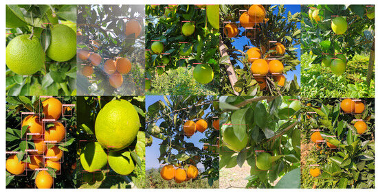 However, although algorithms such as deep learning convolutional neural networks and YOLO models can detect different targets quickly and accurately, complex and changing natural environments still pose a challenge for fruit detection, such as leaf occlusion, fruit overlap, light changes, brightness changes, target size, and shooting distant views, all of which affect fruit ripeness detection precision and accuracy [17]. In addition, the existing fruit ripeness detection studies mainly focus on crops such as apple [18], tomato [19], jujube [20], mango [21], and oil palm [22]; as an economic fruit crop of China’s National Geographic indication products, there are few related studies on Gannan navel orange.