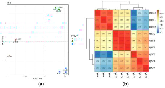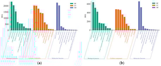 GO enrichment analysis diagram. (a) Histogram showing functional enrichment analysis of the Q1if–Q1hf group; (b) histogram showing functional enrichment analysis of the Q1if–Q2if group.