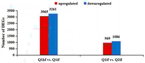In this study, Q1hf, Q1if, and Q2if were analyzed for differential gene expression, to determine the resistance genes in Qinyou 1. For this purpose, two subgroups—Q1hf and Q1if, as well as Q1if and Q2if—were used and we identified 6326 DEGs (3065 upregulated and 3261 downregulated) between Q1hf and Q1if and 2055 DEGs (969 upregulated and 1086 downregulated) between Q1if and Q2if (Figure 2). These results demonstrated the differences in the expression levels of resistance genes and suggested that these DEGs might be related to anthracnose resistance in Qinyou 1.
