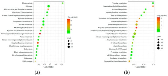 KEGG enrichment analysis diagram. (a) KEGG pathway enrichment analysis of DEGs in the Q1if–Q1hf group; (b) KEGG pathway enrichment analysis of DEGs in the Q1if–Q2if group.