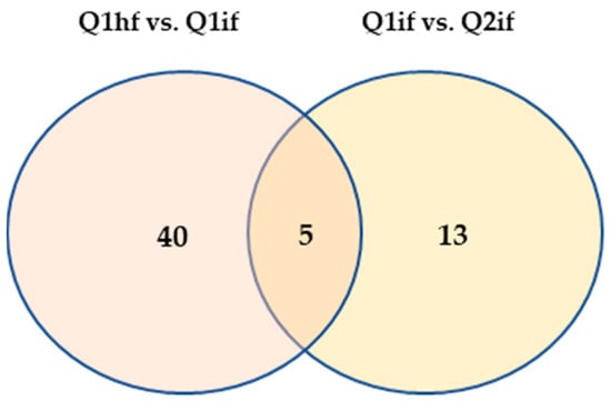 KEGG functional enrichment analysis identified the top 20 most significantly enriched pathways for each group. The amino acid biosynthesis pathway was significantly enriched in the Q1hf–Q1if group, suggesting that the disease may enhance the production of essential amino acids in this variety, contributing to the synthesis of antimicrobial peptides or other secondary metabolites with antifungal properties (Figure 4a). In contrast, plant–pathogen interactions were significantly enriched in the Q1if–Q2if group (Figure 4b), suggesting that fungal attack may enhance metabolic activities in the two varieties and anthracnose incidence may result in a more robust response.