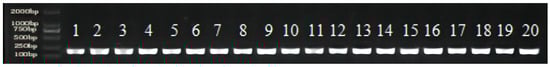 Agarose gel showing cDNA bands obtained from the samples of five walnut varieties. 1–4: Qinyou 1 samples after 0, 3, 6, and 9 days of inoculation; 5–8: Qinyou 2 samples after 0, 3, 6, and 9 days of inoculation; 9–12: Qinyou 3 samples after 0, 3, 6, and 9 days of inoculation; 13–16: Diamond 1 samples after 0, 3, 6, and 9 days of inoculation; 17–20: Liaohe 1 samples after 0, 3, 6, and 9 days of inoculation.