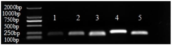 With the walnut 18S rRNA gene as the reference, bright and clear cDNA bands were obtained for the walnut samples (Figure 6). Furthermore, sample RNA showed five bands, indicating that the primers were able to successfully amplify the target gene (Figure 7).