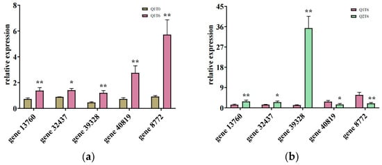 The expression of gene13760 showed a significantly increasing trend from 0 to 6 days after inoculation in the fruits of the five walnut varieties (Figure 9a). Among them, the highest mean relative expression of gene13760 was 9.37, in Qinyou 3 fruits.