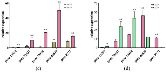 The relative expression of differential genes using real-time fluorescence quantitation and transcriptome sequencing. (a,c) Real-time fluorescence quantitative expression of differential genes; (b,d) transcriptome sequencing expression. Q1T0: Qinyou 1 inoculated with anthrax for 0 d; Q1T6: Qinyou 1 inoculated with anthrax for 6d; Q2T6: Qinyou 2 inoculated with anthrax for 6 d. * and ** denote pairwise differences, * means significant, ** means very significant.