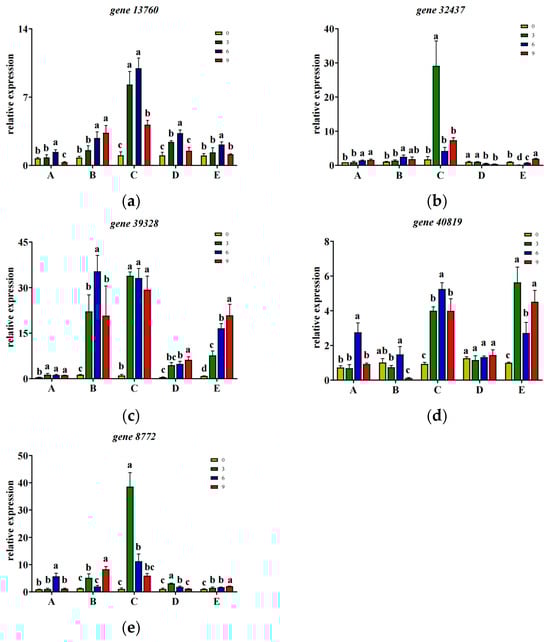 Expression levels of DEGs in walnut fruits inoculated with the pathogen. (a): DEGs expression levels in Qinyou 1 walnut fruits after pathogen inoculation. (b): DEGs expression levels in Qinyou 2 walnut fruits after pathogen inoculation. (c): DEGs expression levels in Qinyou 3 walnut fruits after pathogen inoculation. (d): DEGs expression levels in Liaohe 1 walnut fruits after pathogen inoculation. (e): DEGs expression levels in Diamond 1 walnut fruits after pathogen inoculation. A: Qinyou 1, B: Qinyou 2, C: Qinyou 3, D: Liaohe 1, E: Diamond 1; a, b, c as a sign of significant differences; 0, 3, 6, 9 indicates the number of days the virus was inoculated.