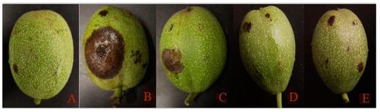 Different walnuts were inoculated with anthrax for 9 d. (A): Qinyou 1; (B): Qinyou 2; (C): Qinyou 3; (D): Liaohe 1; (E): Diamond 1.