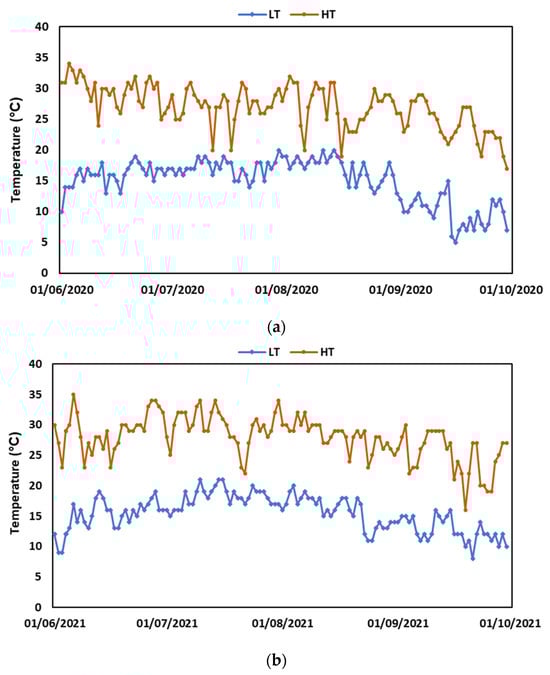 Maximum and minimum temperature data at the experimental site during quinoa growth period in (a) 2020 and (b) 2021.