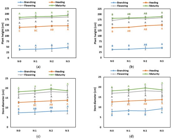 Plant height in 2021 (a) and 2022 (b) and stem diameter in 2021 (c) and 2022 (d) of quinoa under different N fertilizer levels. N0: 0 kg ha−1; N1: 90 kg ha−1; N2: 120 kg ha−1; and N3: 150 kg ha−1. The branching, heading, flowering, and maturity stages were BBCH 2, BBCH 5, BBCH6, and BBCH 8, respectively, according to the BBCH scale of quinoa [30]. Error bars indicate standard deviations (n = 3). Different letters indicate significant differences among N levels within a growth stage calculated using Tukey’s HSD test (p ≤ 0.05).