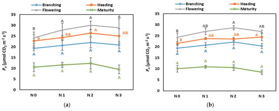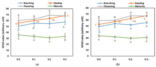 SPAD values of quinoa in 2021 (a) and 2022 (b) under different N fertilizer levels. N0: 0 kg ha−1; N1: 90 kg ha−1; N2: 120 kg ha−1; and N3: 150 kg ha−1. The branching, heading, flowering, and maturity stages were BBCH 2, BBCH 5, BBCH6, and BBCH 8, respectively, according to the BBCH scale of quinoa [30]. Error bars indicate standard deviations (n = 3). Different letters indicate significant differences among N levels within a growth stage calculated using Tukey’s HSD test (p ≤ 0.05).