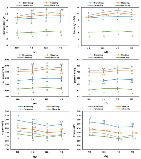 Photosynthesis rate (a,b), transpiration rate (c,d), stomatal conductance (e,f), and intercellular CO2 concentration (g,h) of quinoa genotypes in 2021 (a,c,e,g) and 2022 (b,d,f,h) under different N fertilizer levels. N0: 0 kg ha−1; N1: 90 kg ha−1; N2: 120 kg ha−1; and N3: 150 kg ha−1. The branching, heading, flowering, and maturity stages were BBCH 2, BBCH 5, BBCH 6, and BBCH 8, respectively, according to the BBCH scale of quinoa [30]. Error bars indicate standard deviations (n = 3). Different letters indicate significant differences among N levels within a growth stage calculated using Tukey’s HSD test (p ≤ 0.05).