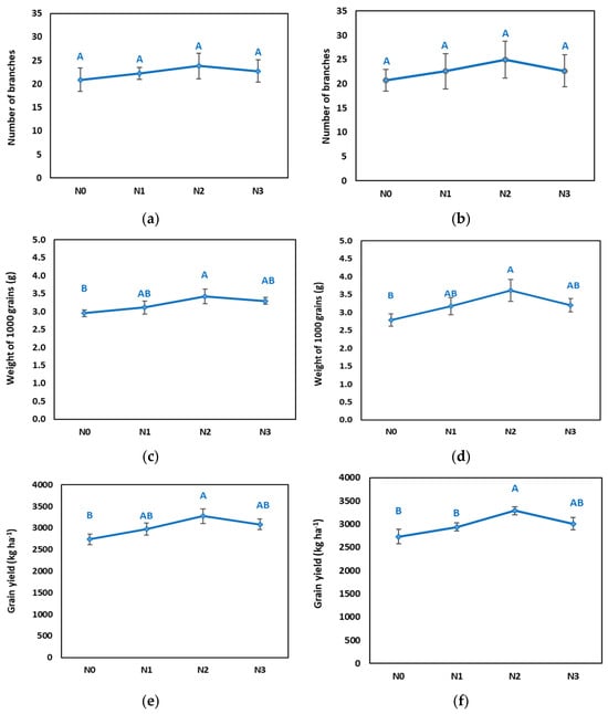 At maturity, the data on the number of branches, weight of 1000 grains, and grain yield were recorded for the years 2021 and 2022. The average number of branches increased from 21 at N0 to 23 at N2 and further to 24 at N3 (Figure 5a,b). However, the impact of nitrogen fertilizer was found to be statistically non-significant. The 1000-grain weight (Figure 5c,d) and grain yield (Figure 5e,f) were significantly influenced by nitrogen fertilizer rates. At N1, the 1000-grain weight and grain yield showed a slight increase compared to N0, although this difference was not statistically significant. At N2, there was a significant increase of 16 and 30% in the 1000-grain weight and a 19.7 and 20.5% increase in grain yield in 2020 and 2021, respectively, compared to N0. At N3, the 1000-grain weight and grain yield were found to be statistically similar to those at N1.