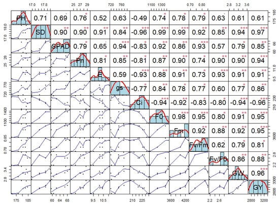 Correlation of biomass, photosynthesis-related, chlorophyll fluorescence, and yield traits of quinoa. PH: plant height; SD: stem diameter; Pn: photosynthesis rate; E: transpiration rate; gs: stomatal conductance; Ci: intercellular CO2 concentration; F0: initial fluorescence; Fm: maximum fluorescence; Fv/Fm: maximum photosynthetic efficiency; GW: weight of 1000 grains; GY: grain yield. *, **, and *** indicate significance at 0.05, 0.01, and 0.001 probability levels using Pearson correlation.