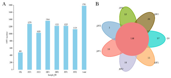 (A) The number of fungal OTUs in the seven samples. (B) Venn diagram of fungal soil samples from the seven different treatments. CK represents the control group; J represents different irrigation treatments; F represents different microbial fertilizer treatments.