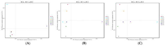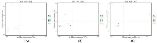 Principal component analysis (PCA) of the fungal microbial communities of samples: (A) PC1 vs. PC2. (B) PC1 vs. PC3. (C) PC2 vs. PC3.