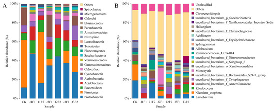 At the phylum level, Proteobacteria, Firmicutes, Bacteroidetes, Acidobacteria, Actinobacteria, Cyanobacteria, Chloroflexi, Gemmatimonadetes, Verrucomicrobia, Saccharibacteria, and Planctomycetes were the dominant phyla, with over 1% abundance in the soil samples (Table S3a). Firmicutes accounted for more than 50% of CK, followed by Cyanobacteria (18%) and Proteobacteria (11%). Similarly, the highest percentage in J1F2 was Firmicutes, with 54%, followed by Proteobacteria (16%) and Bacteroidetes (12%). However, the abundance of each phylum in the remaining five treatments was different from the two treatments mentioned earlier. Proteobacteria was the most abundant phylum in these five treatments: J1F1 (47%), J2F1 (34%), J2F2 (44%), J3F1 (37%), and J3F2 (27%). Firmicutes accounted for less than 0.5% of J1F1 and J2F2, 6% of J2F1, 13% of J3F1, and 16% of J3F2. Bacteroidetes accounted for an average of about 7–19% in the seven treatments and slightly less in CK. In addition to their high proportion in CK, Cyanobacteria were up to 23% in J2F1, 10% in J3F2, and less than 1% in the remaining four treatments. Acidobacteria were greater than 10% in the J1F1, J2F2, and J3F1 treatments, with 14%, 14%, and 10%, respectively. Actinobacteria were particularly abundant in J3F2 (15%), and among the seven sample treatments, J1F1 was most similar to J2F2, while CK and J1F2 differed most from the other treatments in composition (Figure 3A). The results showed that there was a competitive effect between Firmicutes and Proteobacteria in the CK, J1, and J2 treatments—where one of them was significantly higher, the other would be lower—while J3 made the competition between the two weaker. Compared to CK, the application of microbial fertilizers contributed to a significant increase in Proteobacteria, Acidobacteria, Chloroflexi, Gemmatimonadetes, and Verrucomicrobia. For Actinobacteria, the J1 and J2 treatments decreased their relative abundance, while J3 significantly increased the Actinobacteria abundance. For Cyanobacteria, J2F2 increased their abundance, which was much lower than CK in the other treatments.