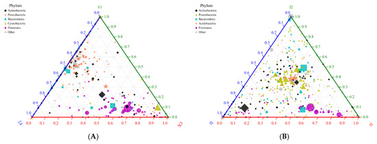 Ternary diagrams: (A) Ternary diagram of the CK, F1, and F2 treatments at the bacterial phylum level. (B) Ternary diagram of the J1, J2, and J3 treatments at the bacterial phylum level. The three corners of the triangle represent three samples, which are represented by three colors, and the three edges are used to measure the species abundance of the corresponding color samples. The circles in the triangle represent the species classification of all genera contained at a certain level, the circle size represents the average relative abundance of the species, and the circle color in the legend represents the species classification with the highest abundance of the five phyla.