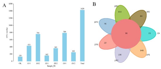 (A) The number of OTUs of bacteria in seven samples. (B) Venn diagram of bacterial soil samples in seven treatments. CK represents the control group; J represents different irrigation treatments; F represents different microbial fertilizer treatments.