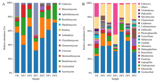 At the phylum level, twelve fungal phyla were identified: Ascomycota, Basidiomycota, Mortierellomycota, Cercozoa, Glomeromycota, Chytridiomycota, Anthophyta, Rotifera, Olpidiomycota, Rozellomycota, Aphelidiomycota, and Mucoromycota. Ascomycota were distributed in all treatments, and were highly abundant. Except for the J2F1 treatment, their contents were more than 40%, and the lowest content of 31% was found in the J2F1 treatment (Table S8a). From the image, we can see that Ascomycota, Basidiomycota, and Mortierellomycota have obvious advantages. Ascomycota ranked first, accounting for 31% to 71%; Basidiomycota were second, accounting for 4% to 25%. Mortierellomycota were 18% in the J1F1 treatment, which was their largest representation (Figure 7A). The study showed that a total of twelve phyla were detected in all treatments; only the J3F1 treatment included all twelve phyla, CK and J3F2 included six of them, the J2 treatment included seven phyla, and J1F1 and J1F2 included eight and nine phyla, respectively, indicating that the fungal phylum levels were reduced by J3F2. Ascomycota were the dominant phylum in each treatment, and J2 and J3 were beneficial to Basidiomycota, while the changing water and fertilizer treatments contributed to the production of Chytridiomycota.