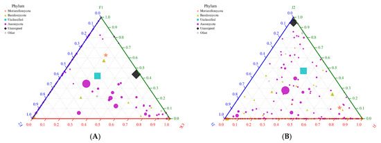 Ternary diagram: (A) Ternary diagram of the CK, F1, and F2 treatments at the fungal phylum level. (B) Ternary diagram of the J1, J2, and J3 treatments at the fungal phylum level.