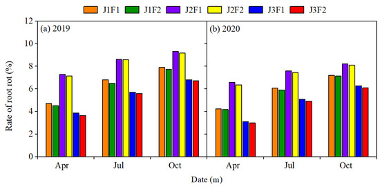 Effects of irrigation and microbial fertilizer on the incidence of root rot of Panax notoginseng. J represents different irrigation treatments; F represents different microbial fertilizer treatments.