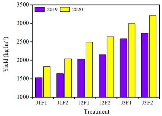 Effects of irrigation and microbial fertilizer on yield. J represents different irrigation treatments; F represents different microbial fertilizer treatments.