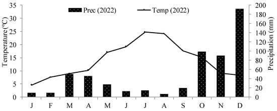 The agronomic evaluation of sewage sludge was based on a pot experiment over two consecutive cycles of lettuce (cv. Summer Wonder) and took place in Bragança in the northeast of Portugal in 2022. The climate of the region is Mediterranean, although with some Atlantic influence. According to the Köppen and Geiger classification, it is of type Csb [33]. The average annual temperature is 12.6 °C, and the precipitation is 772.7 mm. The monthly records of air temperature and precipitation for the year 2022 are presented in Figure 1. The soil used in this trial is a Eutric Regosol [34]. The texture is sandy clay loam (543.7, 238.3, and 218.0 g kg−1 sand, silt, and clay, respectively), the pH is 6.1, the organic C content is 22.5 g kg−1, the value of extractable P is 109.4 mg (P2O5) kg−1 and that of K is 180.0 mg (K2O) kg−1.
