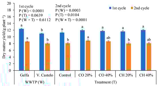 The DMY clearly differed between the two growing cycles, with the second cycle producing only 71% of the first one (Figure 2). When comparing the effects of sewage sludge from the two WWTPs on lettuce DMY, significant differences were observed in both growing cycles. The higher values were found for the sewage sludge from Gelfa (12.4 and 8.6 g plant−1 for the first and second growing cycles, respectively) compared to V. Castelo (11.0 and 8.1 g plant−1) WWTP. In the first growing cycle, no significant differences were found between treatments, with average values ranging from 11.3 (control) to 12.1 (CH 40%) g plant−1. However, in the second growing cycle, significant differences emerged between treatments. The highest average values were observed for sewage sludge treated with calcium oxide (8.9 and 8.7 g plant−1 for CO 20% and CO 40%, respectively), while the lowest values were recorded for the control (8.1 g plant−1) and CH 20% (8.0 g plant−1).