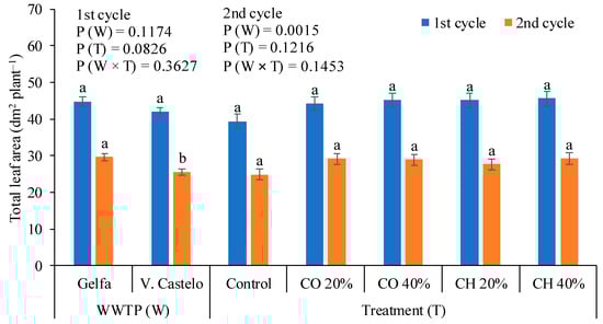 Total lettuce leaf area showed a pattern somewhat similar to DMY, albeit with some differences (Figure 3). Lettuces grown in the second cycle exhibited only 65% of the leaf area recorded in the first growth cycle. The average total leaf area of lettuces was also higher when treated with sewage sludge from Gelfa, but significant differences were only observed in the second growth cycle (29.6 and 25.5 dm2 plant−1 in the first and second growth cycles, respectively). No significant differences were observed among treatments, indicating that the total leaf area estimate is a variable with less discriminative power than DMY.