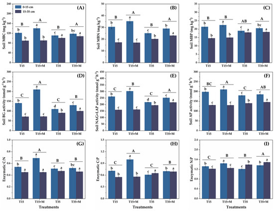 Soil microbial biomass levels in the 0–15 cm layer were significantly higher under T15 and T15+M treatments than under T35 treatment, and T35+M treatment had the highest soil microbial biomass in the 15–35 cm layer (p < 0.05, Figure 1A–C). Soil MBC, MBN, and MBP levels in the 0–15 cm layer were significantly higher under T15 and T15+M treatments than those under T35 treatment by 9.6–26.5%, 21.7–40.8%, and 12.6–18.1%, respectively (p < 0.05). Soil MBC, MBN, and MBP levels in the 15–35 cm layer were significantly higher under T35+M treatment than those under T15 and T15+M treatments by 19.1–20.3%, 33.4–35.3%, and 22.2–25.5%, respectively (p < 0.05). Soil BG, NAG+LAP, and AP activities (Figure 1D–F) and enzymatic C:N, C:P, and N:P activity ratios (Figure 1G–I) followed a similar pattern.