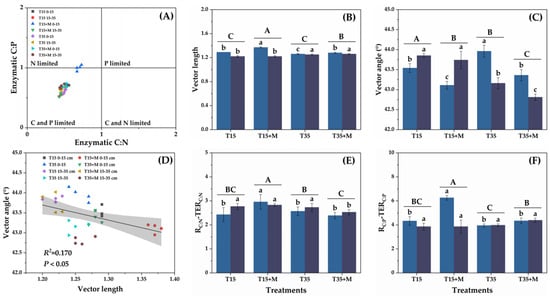 However, a change in the activity of only one enzyme cannot fully represent microbial resource limitation, which needs integral evaluation via the relative availabilities of multiple soil nutrients [19,20,21]. Studying microbial resource limitation thus also needs an analysis of extracellular enzymatic stoichiometry. In this study, the growth of soil microorganisms tended to be co-limited by C and P but not N. Microbial resource limitation was not converted to N limitation because the soil was N-saturated in the Chernozem region [21,32]. However, T35+M treatment was lower in RC:N-TERC:N than in other treatments, which means that the incorporation of inversion tillage and organic fertilizer application has weakened the status of N saturation and improved the holding capacity of living and non-living organisms. The variation in the enzymatic C:P activity ratio indicated that the range of microbial P limitation varied. The C:P activity ratio in the 0–35 cm layer was significantly higher under T35+M treatment than under T35 treatment (Figure 1), indicating that organic fertilizer application could substantially reduce microbial P limitation, which is likely due to organic matter improving the soil P availability [21]. Based on the vector angle and the enzymatic C:P activity ratio, organic fertilizer application may increase MBC, and the dissolved organic matter contents were the most important factor impacting microbial P limitation. T35+M treatment had a lower vector length in the 0–35 cm layer than in the T15+M treatment, which could contribute to the fact that inversion tillage led to the homogenization of SOC throughout the whole cultivated horizon, combined with the application of organic fertilizer also increasing the DOC content, thus decreasing the microbial C limitation [15,21,33,34].