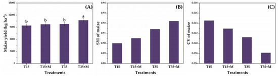 Responses of maize yield to incorporation of inversion tillage and organic fertilizer application. Notes: T15, conventional tillage with no organic fertilizer; T15+M, conventional tillage with organic fertilizer; T35, inversion tillage with no organic fertilizer; T35+M, inversion tillage with organic fertilizer. Maize yield (A), SYI, sustainable yield index (B), and CV, coefficient of variance (C). Lowercase letters indicate the significance of the difference between different treatments.